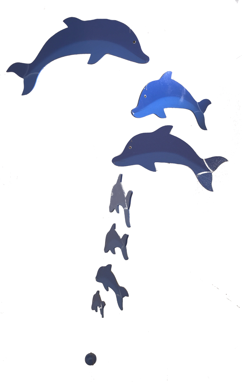 Our School of Dolphins Mobile consists of 7 dolphins that hang one beneath the other and a ball. They swim on currents of air, so if you put them somewhere with a bit of a breeze they are constantly moving around. Otherwise if you fancy a more static display you can hang them against a wall