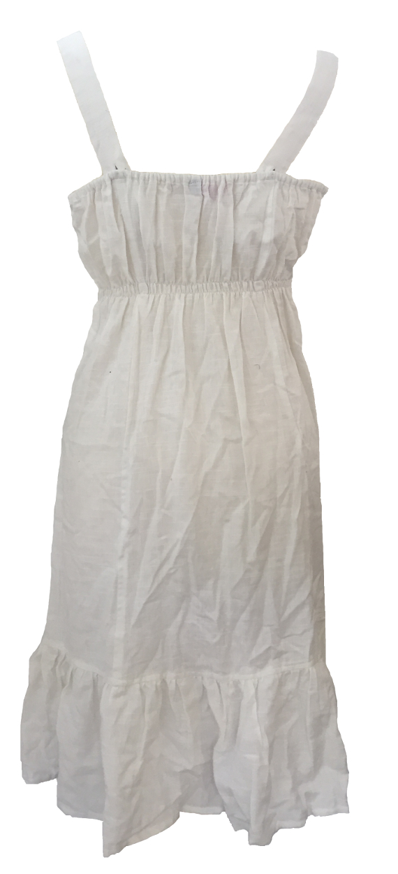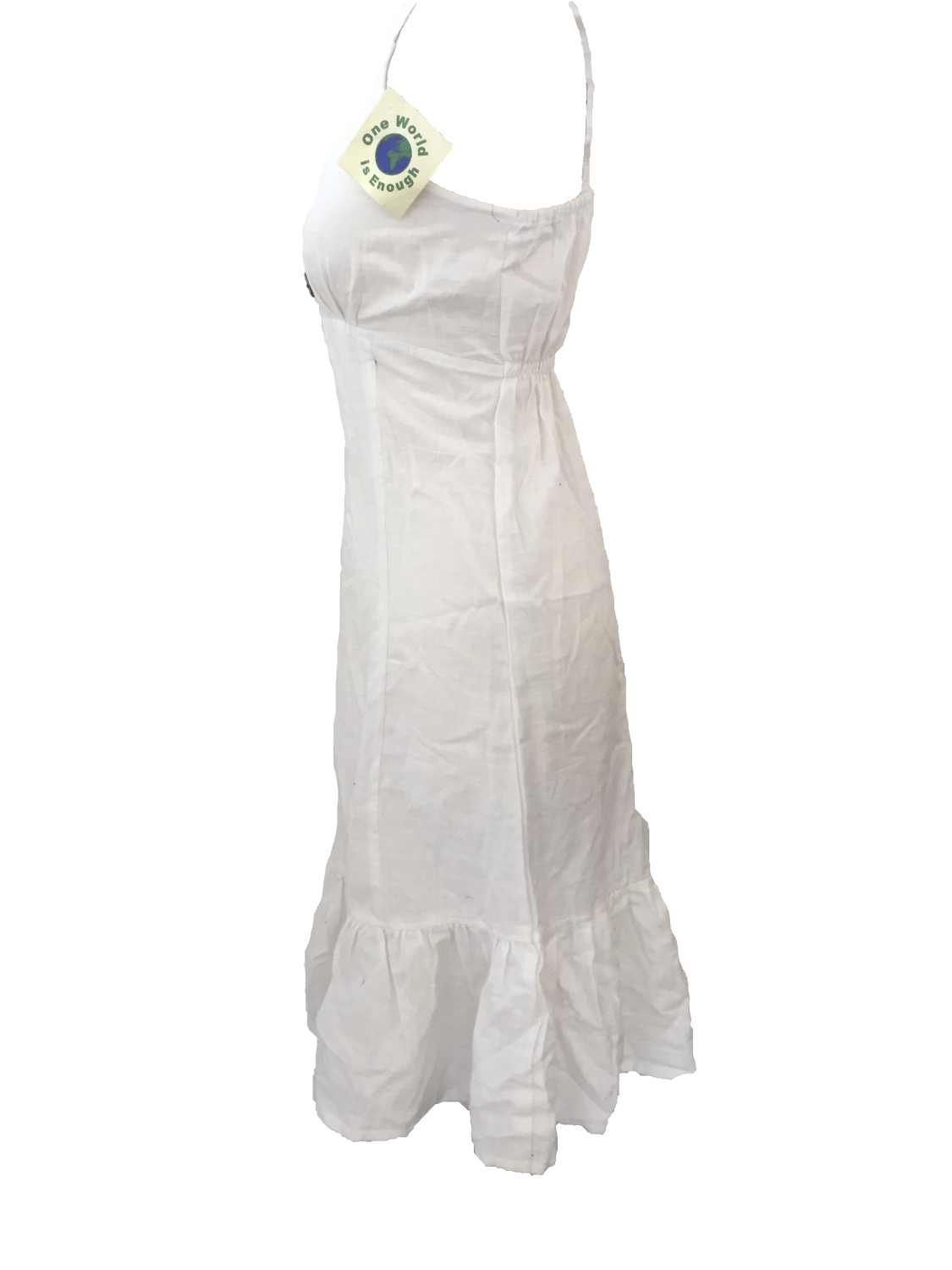 They have a very flattering cut, fitted over the bust and flowing over the hips. They have a ruffle at the bottom which finishes the dress nicely. They are elasticated at the back to ensure a good comfortable fit. The straps are secured by a cotton button at the back and the straps have two button holes so they can be worn with longer or shorter straps.