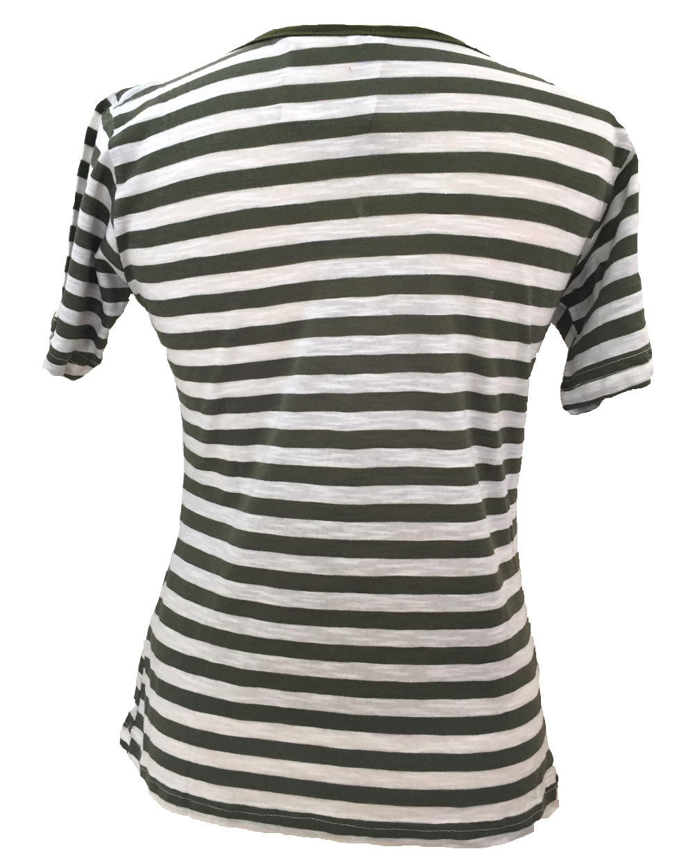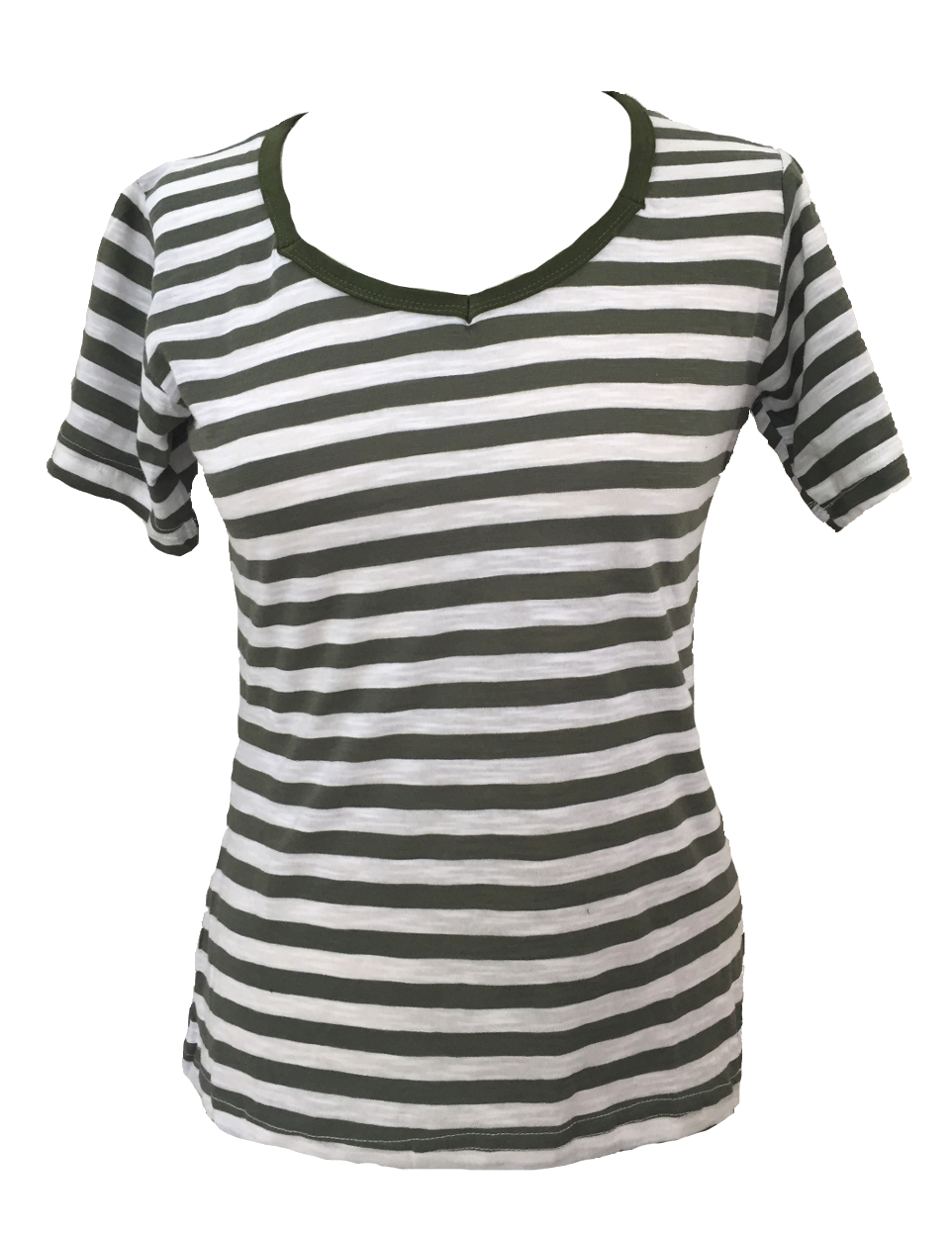 Our Stripey Fitted Ladies T Shirts come in green on white or black on olive green and in sizes 10 - 16.