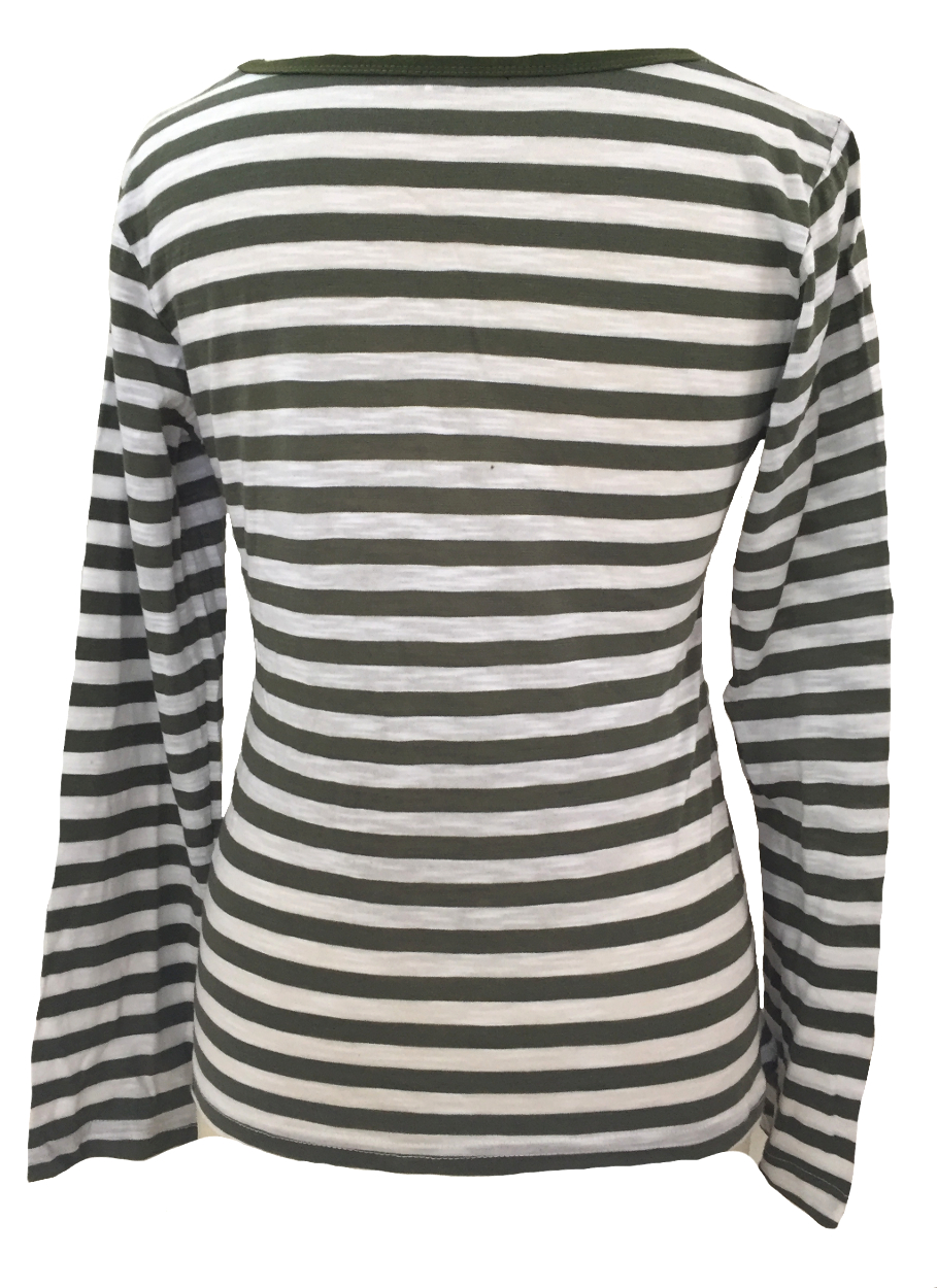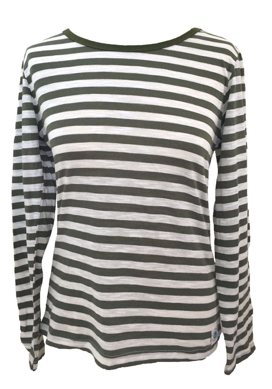 Our Stripey Ladies Long Sleeve Fitted T Shirts come in green on white or black on olive green and in sizes 10 - 16.
