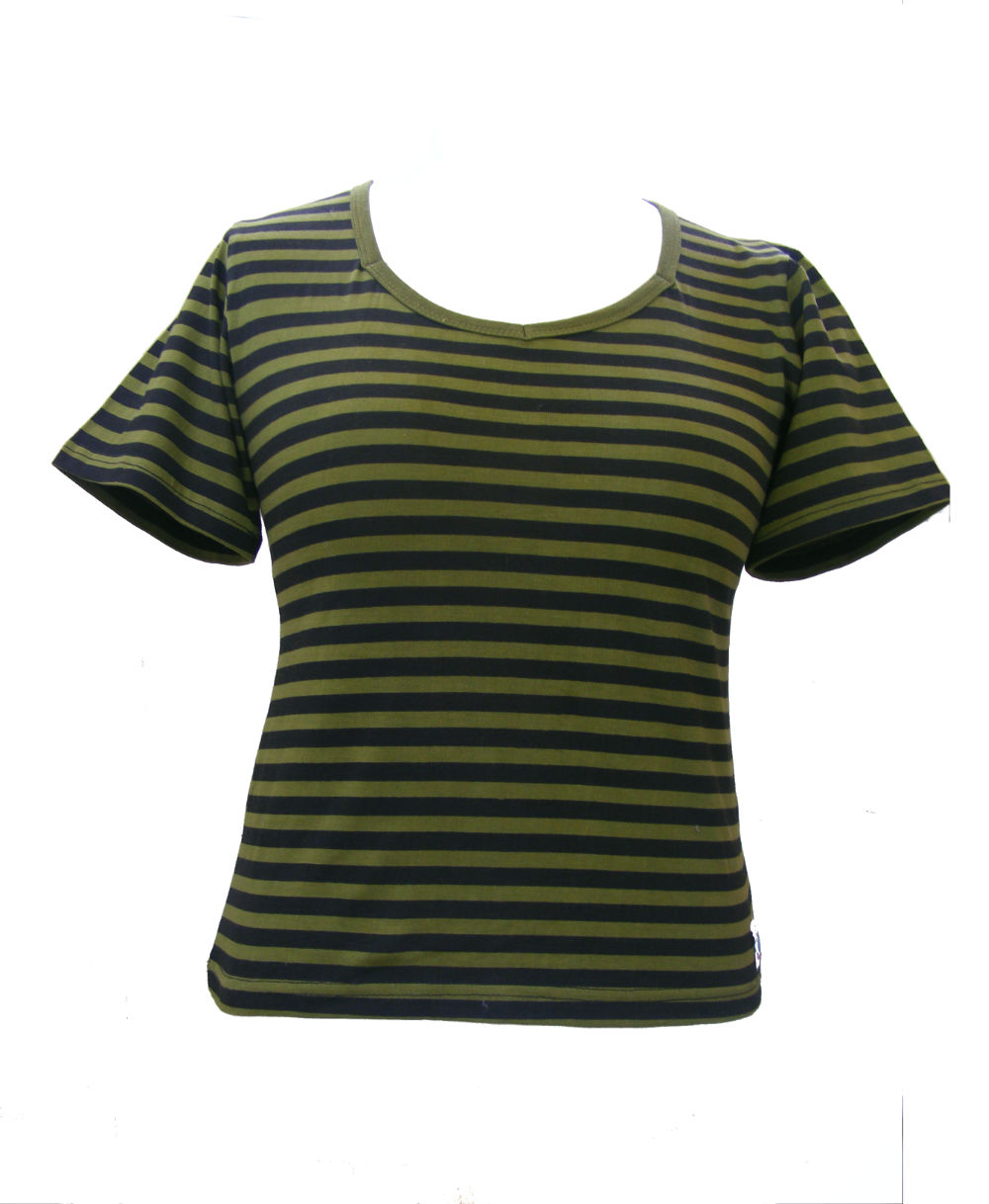 Our Stripey Fitted Ladies T Shirts come in green on white or black on olive green and in sizes 10 - 16.