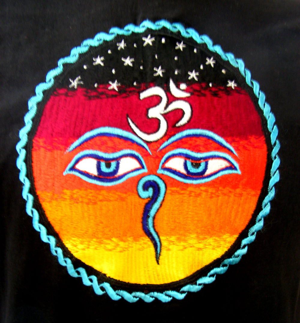 Our Classic Kathmandu T shirt depicts the Eyes of the Buddha at sunset. The Eyes are the symbol of Kathmandu, which look down on the city from every Buddhist Stupa. Our T Shirt also depicts the powerful Om sign, a powerful meditation and Yoga sign.