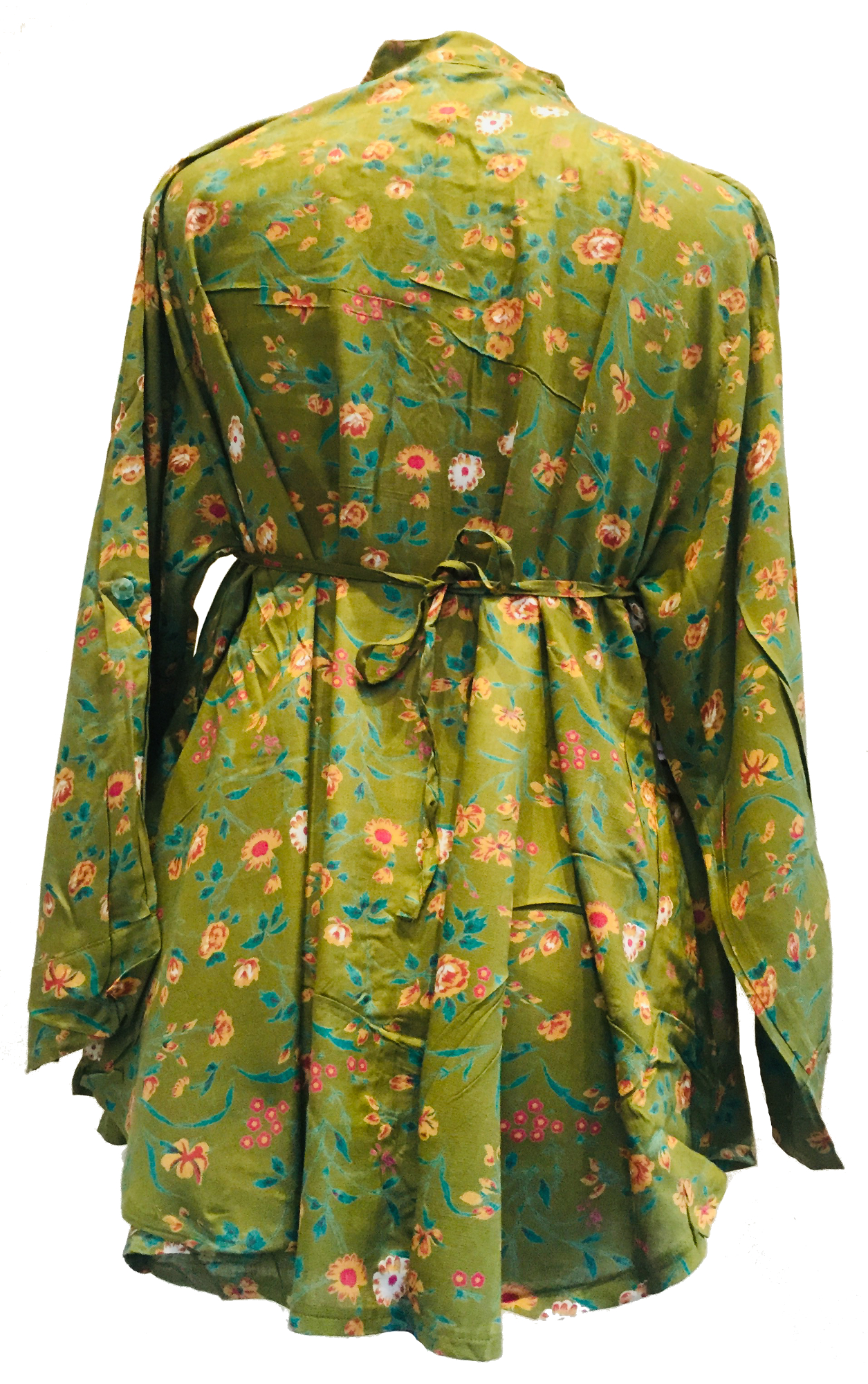 They feature a high mandarin style collar, they are pleated at the front, they open at the front like a shirt and have buttons all the way down. They have ties at the back to give our blouses a good shape. They come in the choice of hot pink or olive green.