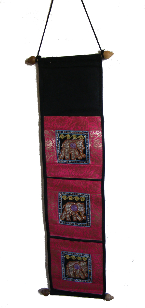 They come in the choice of blue, purple or pink colours. The elephant pockets are lined and the back of the hanging is a strong black cotton. They come ready to hang with shaped wooden dowels top and bottom and a strong hanging cord.